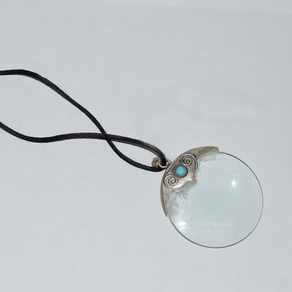 The magnifier has a two-inch glass lens and features a decorative, silver-tone metal bracket with a turquoise stone, where the black, silk neck cord attaches.